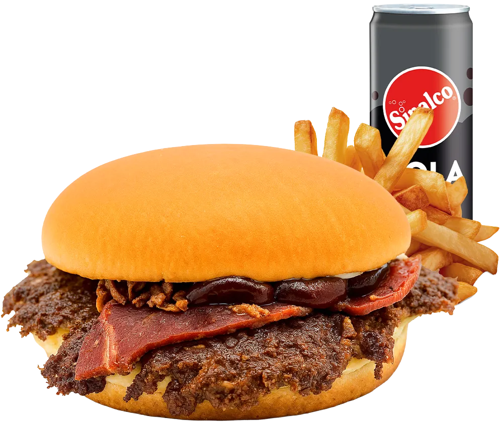 Unsere Buns sind soft, der Bacon aus Rindfleisch schön kross gebraten und die Pommes extra knusprig.